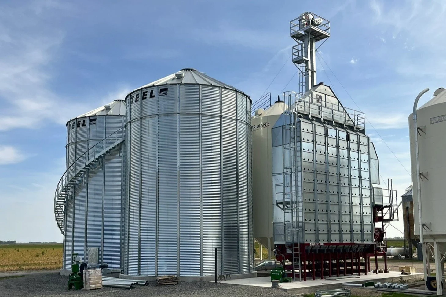 Large galvanized steel storage silos and a grain dryer equipped with a grain bin temperature monitoring system to prevent moisture migration in Western Canadian farming conditions.